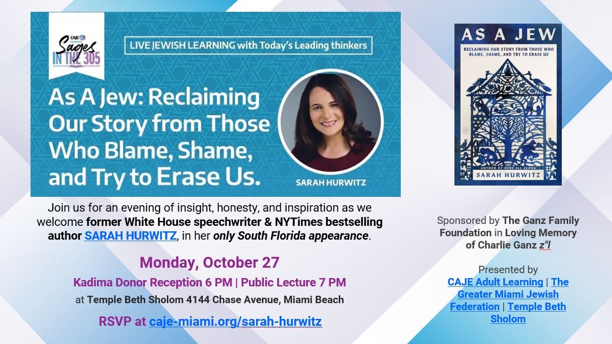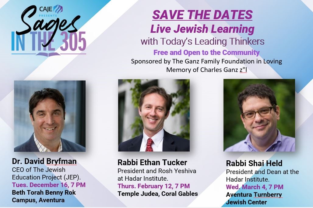 CAJE Adult Learning is thrilled to unveil its newest community initiative, “SAGES in the 305” — a lively new public lecture series (and yes, the name’s a pun!) bringing some of the brightest Jewish thinkers from across the globe to Miami.