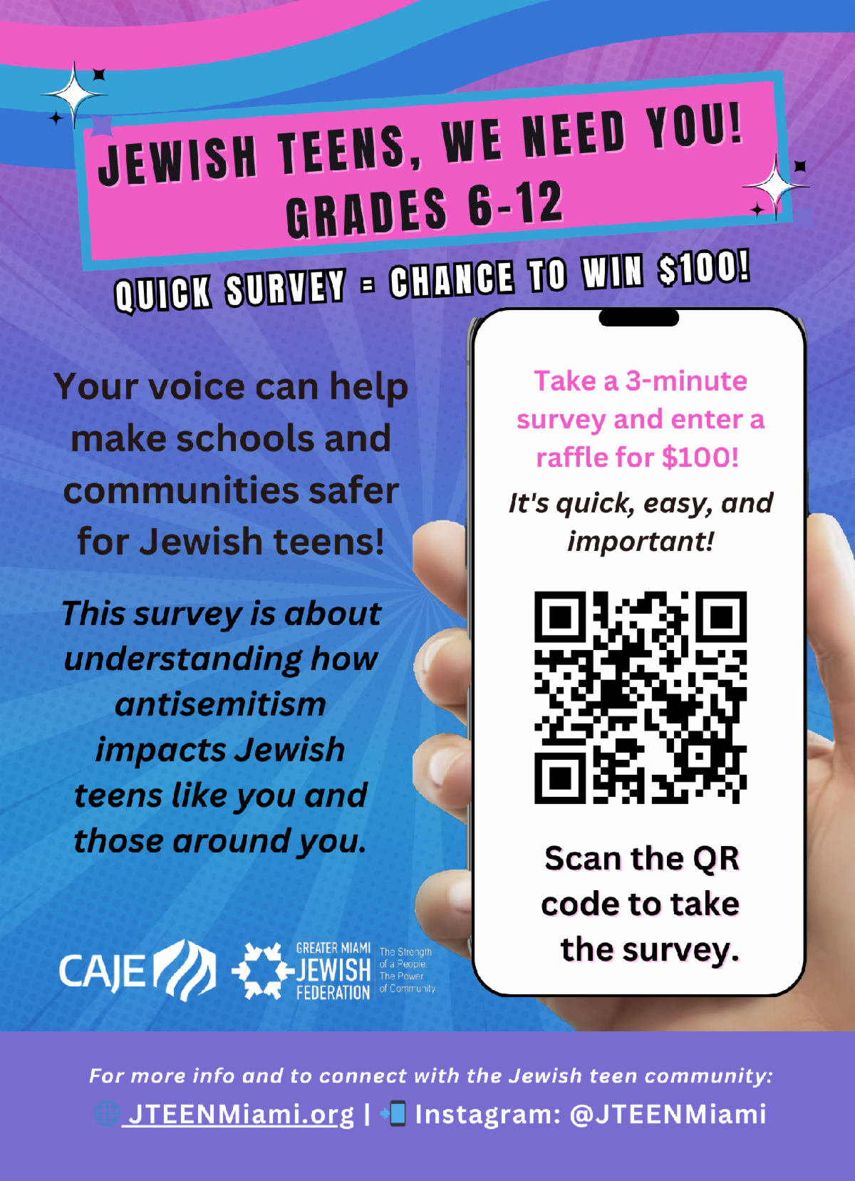 If you know of a Jewish teen in 6-12th grade, please urge them to fill out the survey (and possibly win a $100 gift card) by clicking here or Scan the QR code.
