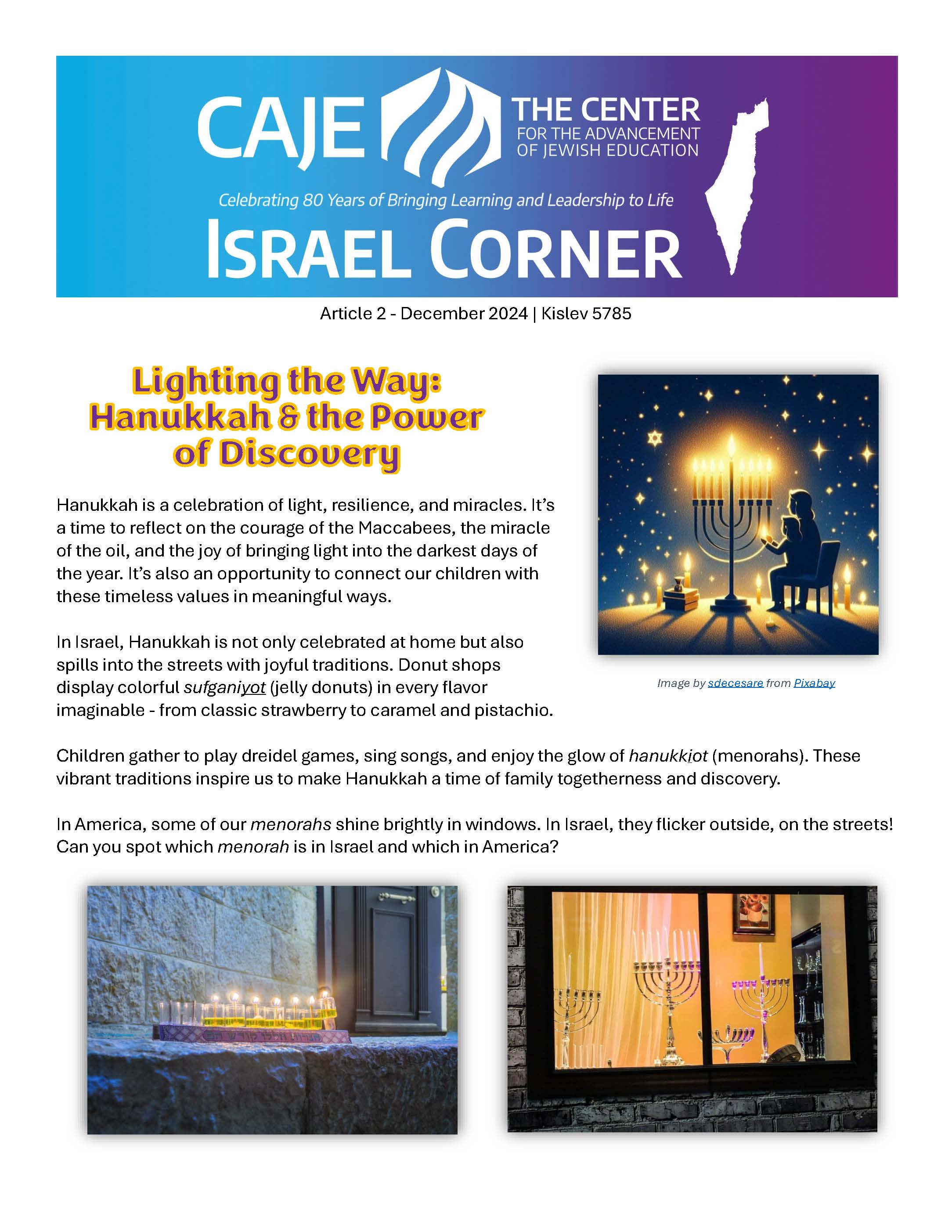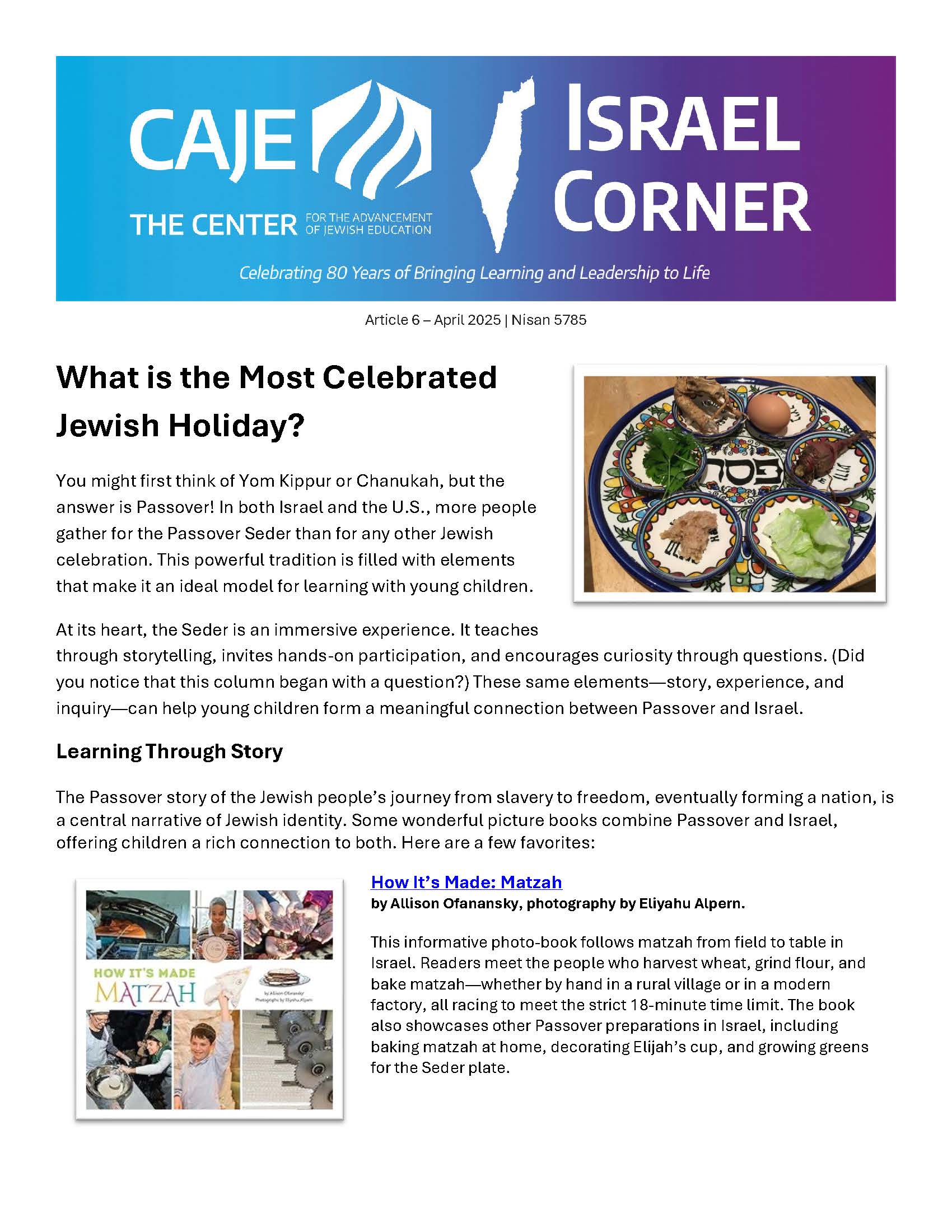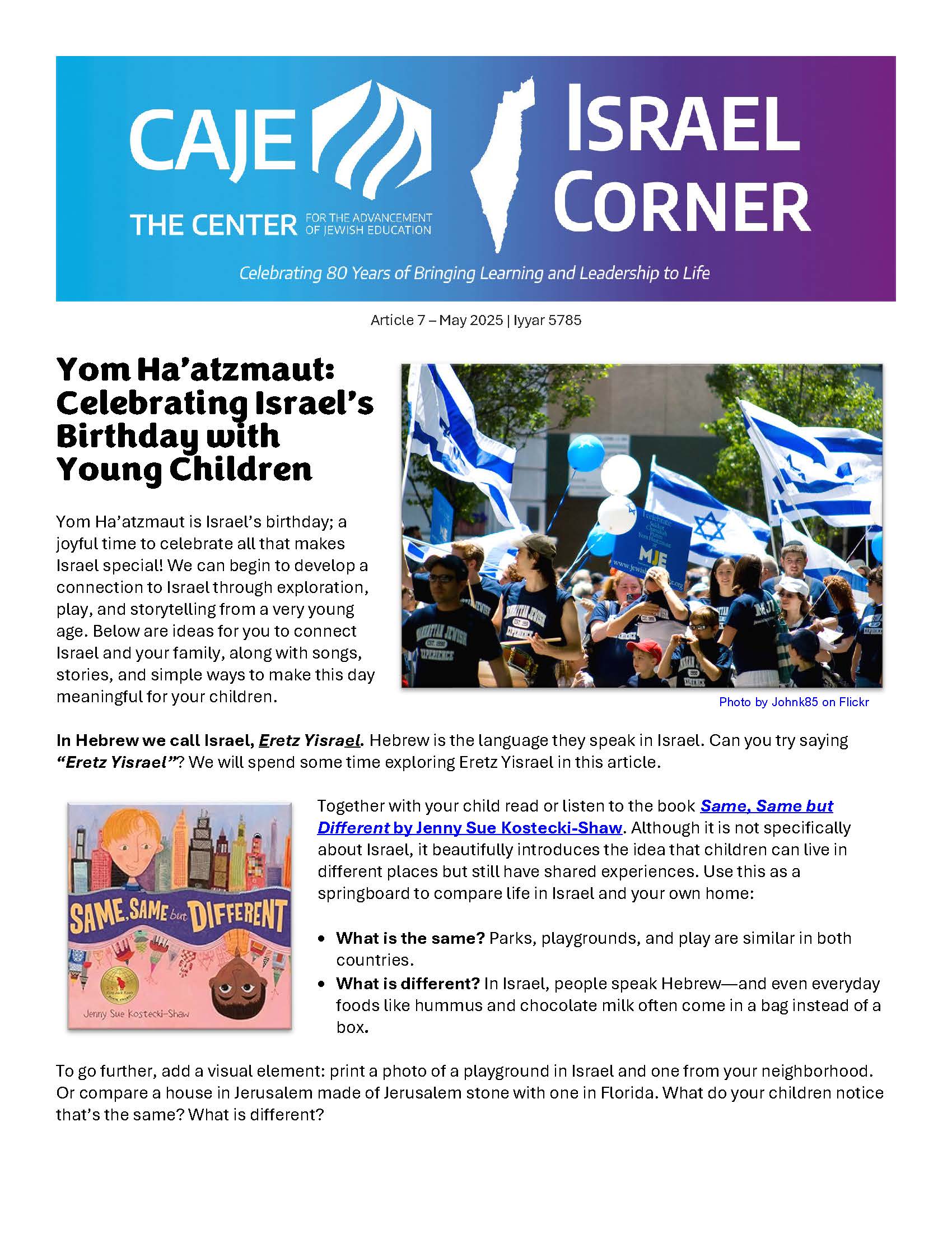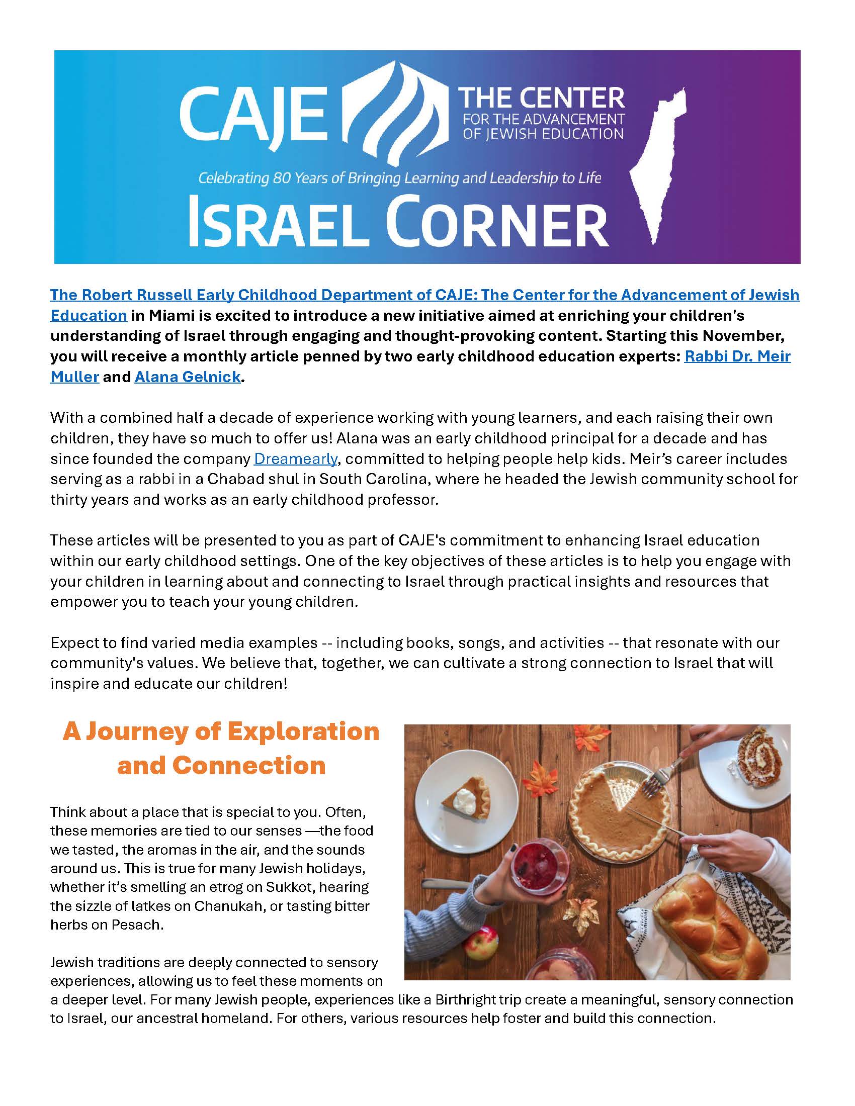 These articles are presented as part of CAJE's commitment to enhancing Israel education within early childhood settings. One of the key objectives of these articles is to help engage families of young children in learning about and connecting to Israel through practical insights and resources.